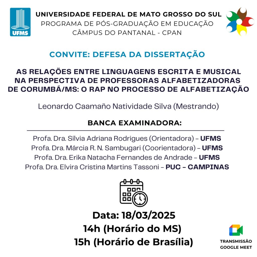 O Programa de Pós-Graduação em Educação convida para a Defesa Pública de Dissertação do mestrando Leonardo Caamaño Natividade Silva, que acontecerá no dia 18 de março de 2025 (terça-feira).
