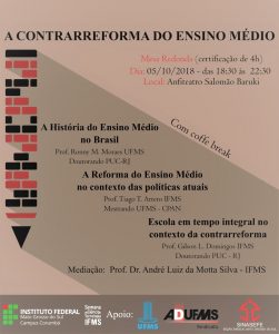 O  referido evento é uma parceria IFMS e UFMS e tem como objetivo debater a contrarreforma do ensino médio no contexto histórico das reformas da educação secundária no Brasil, com destaque ao “novo ensino médio”, originado através da Medida Provisória (MP) nº 246/2016, que deu origem à lei nº 13.415/2017.