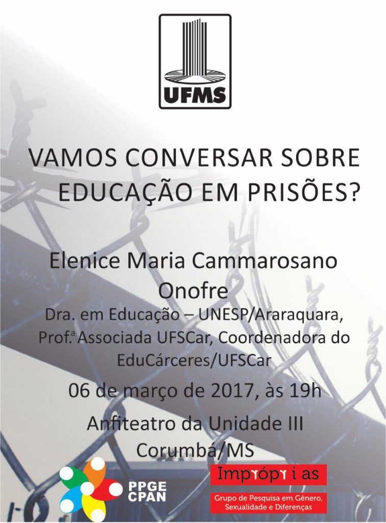 O PPGE tem o prazer de convidar para a palestra “Vamos conversar sobre educação em prisões?” que será ministrada pela professora Doutora Elenice Onofre no dia 06/03/2017, às 19h no Anfiteatro da Unidade III.