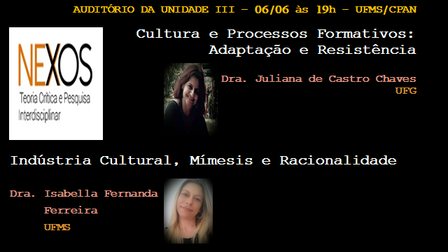 O PPGE/CPAN convida a comunidade acadêmica para as Palestras “Cultura e Processos Formativos: Adaptação e Resistência” – Professora Doutora Juliana de Castro Chaves – UFG e “Indústria Cultural, Mímesis e Racionalidade” – Professora Doutora Isabella Fernanda Ferreira – UFMS.