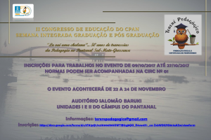 A equipe do Evento mensal do Curso de Pedagogia “Tereré Pedagógico: formação inicial e continuada de professores”, convida a todos para prestigiarem, participarem e apresentarem trabalhos no II Congresso de Educação do CPAN e a Semana Integrada Graduação e Pós-Graduação, tendo como título da chamada: