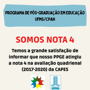 Nosso programa recebe a notícia de que atingimos a nota 4 na avaliação quadrienal 2017-2020 realizada pela CAPES. Queremos parabenizar estudantes, egressos, egressas, professores, professoras, técnicos e técnicas administrativos que não mediram esforços para construir um curso ainda mais forte, comprometido com a educação e educação social para a transformação da realidade local, estadual, nacional e internacional. Continuamos sem soltarmos as mãos!